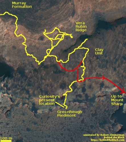 Since my last rover update on January 13, 2020, Curiosity has finally moved on from the base of Western butte, where it spent more than a month drilling a hole and gathering a great deal of geological data. Rather than head downhill and around the plateau and back to its planned route (as indicated by the red line in the map to the right), the Curiosity science team decided to push upward and onto the Greenheugh Piedmont (as indicated by the yellow line).