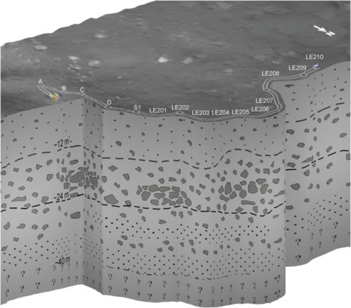 After landing for the first time on the Moon’s farside, the Chang’e-4 lander deployed the Yutu-2 rover, which utilized a dual-frequency Lunar Penetrating Radar (LPR). The LPR was previously tested on the Chang’e-3, and uses ground penetrating radar at 60 MHz and 500 MHz. The LPR instrument collected data during the first two lunar days of Yutu-2’s journey across the Von Kármán crater. While capable of far less depth than instruments like JAXA’s LRS, the LPR on Yutu-2 has a much finer vertical resolution of about 30 centimeter.
