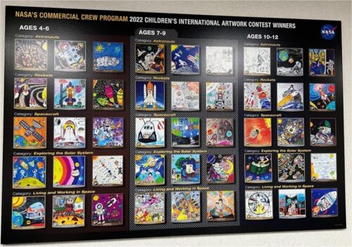 “A display featuring the winning submissions from the Commercial Crew Program’s 2022 Children’s International Artwork Contest hangs in the common area of NASA’s Astronaut Crew Quarters at Kennedy Space Center in Florida.” Credits: NASA, Click for larger image.