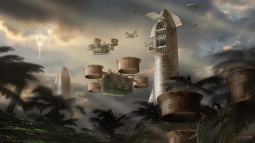 Artist’s view of a delivery of emergency cargo via a VTOL rocket vehicle. Credits: USAF/Ars Technica