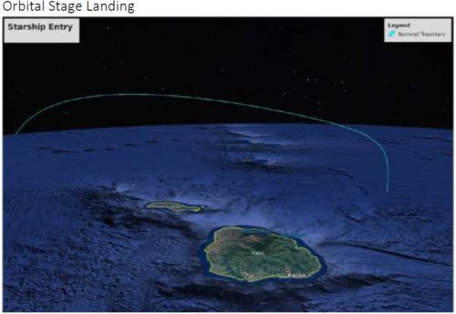 The Starship will fire make its de-orbit burn before completing a full circle of the Earth. The reentry trajectory will put the ship into the ocean near Hawaii. Credits: SpaceX