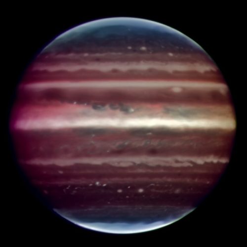 Amazing image of Jupiter taken in infrared light on the night of 17 August 2008 with the Multi-Conjugate Adaptive Optics Demonstrator (MAD) prototype instrument mounted on ESO’s Very Large Telescope. This false colour photo is the combination of a series of images taken over a time span of about 20 minutes, through three different filters (2, 2.14, and 2.16 microns). The image sharpening obtained is about 90 milli-arcseconds across the whole planetary disc, a real record on similar images taken from the ground. This corresponds to seeing details about 300 km wide on the surface of the giant planet. The great red spot is not visible in this image as it was on the other side of the planet during the observations. The observations were done at infrared wavelengths where absorption due to hydrogen and methane is strong. This explains why the colours are different from how we usually see Jupiter in visible-light. This absorption means that light can be reflected back only from high-altitude hazes, and not from deeper clouds. These hazes lie in the very stable upper part of Jupiter’s troposphere, where pressures are between 0.15 and 0.3 bar. Mixing is weak within this stable region, so tiny haze particles can survive for days to years, depending on their size and fall speed. Additionally, near the planet’s poles, a higher stratospheric haze (light blue regions) is generated by interactions with particles trapped in Jupiter’s intense magnetic field. Credits: ESO